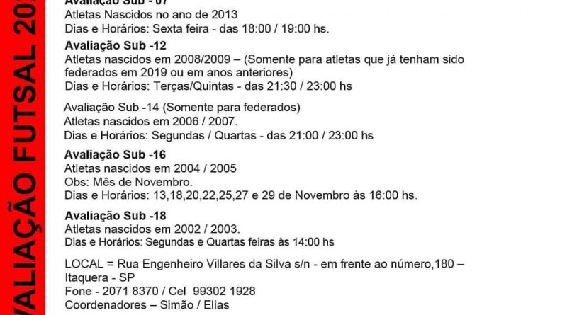 A equipe Elite Itaquerense irá promover avaliações nas categorias iniciação e base para 2020.
