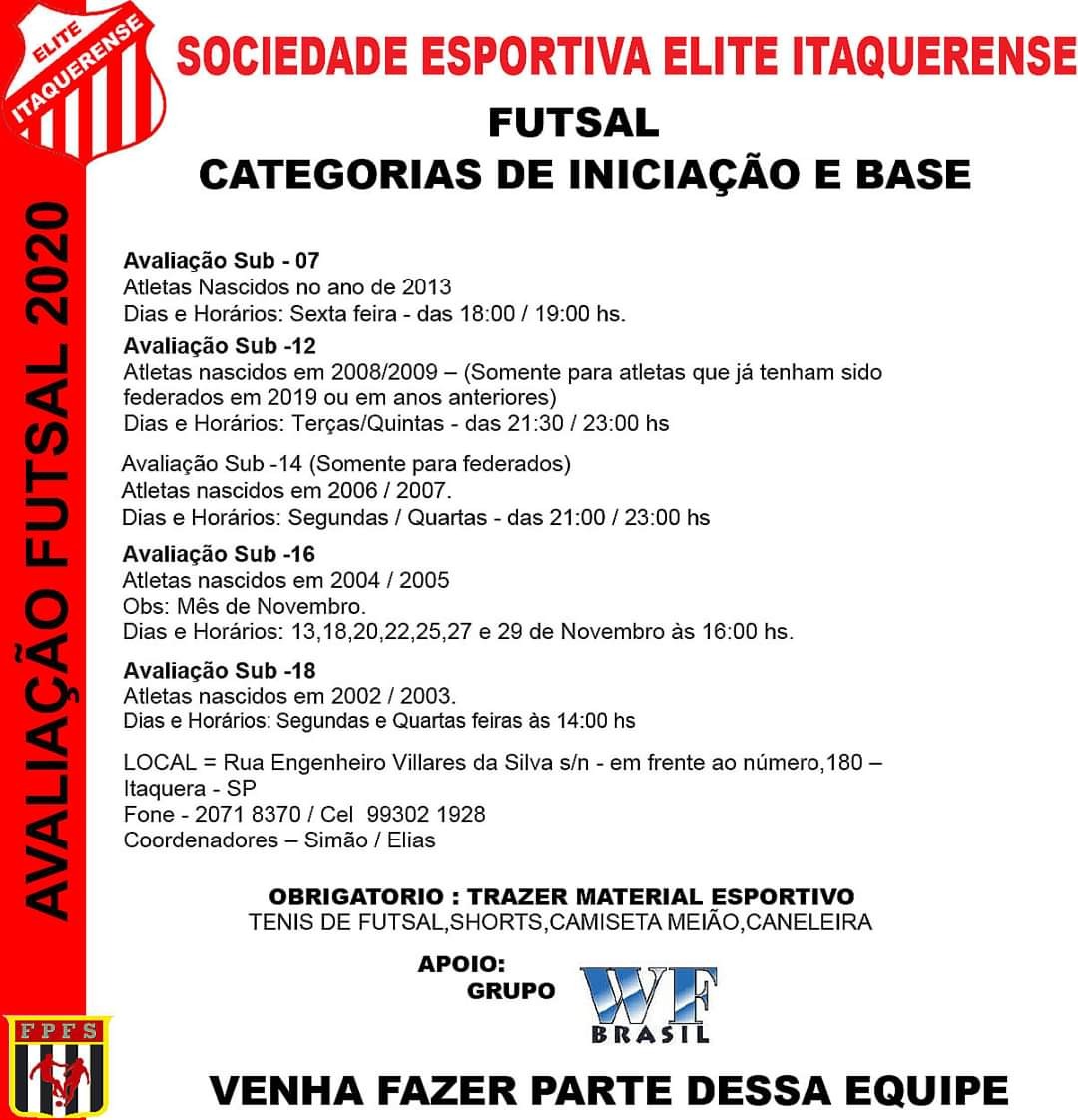 ELITE ITAQUERENSE PROMOVE AVALIAÇÕES NO FUTSAL PARA 2020