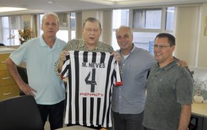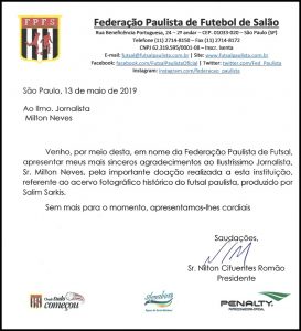 Representando a Federação Paulista de Futsal, estiveram na sede do Terceiro Tempo o presidente Nilton Cifuentes Romão (Ramon) e o coordenador técnico Daniel Mutti. Retribuindo as fotos doadas, eles entregaram a Milton Neves uma carta de agradecimento e uma camisa da FPFS.