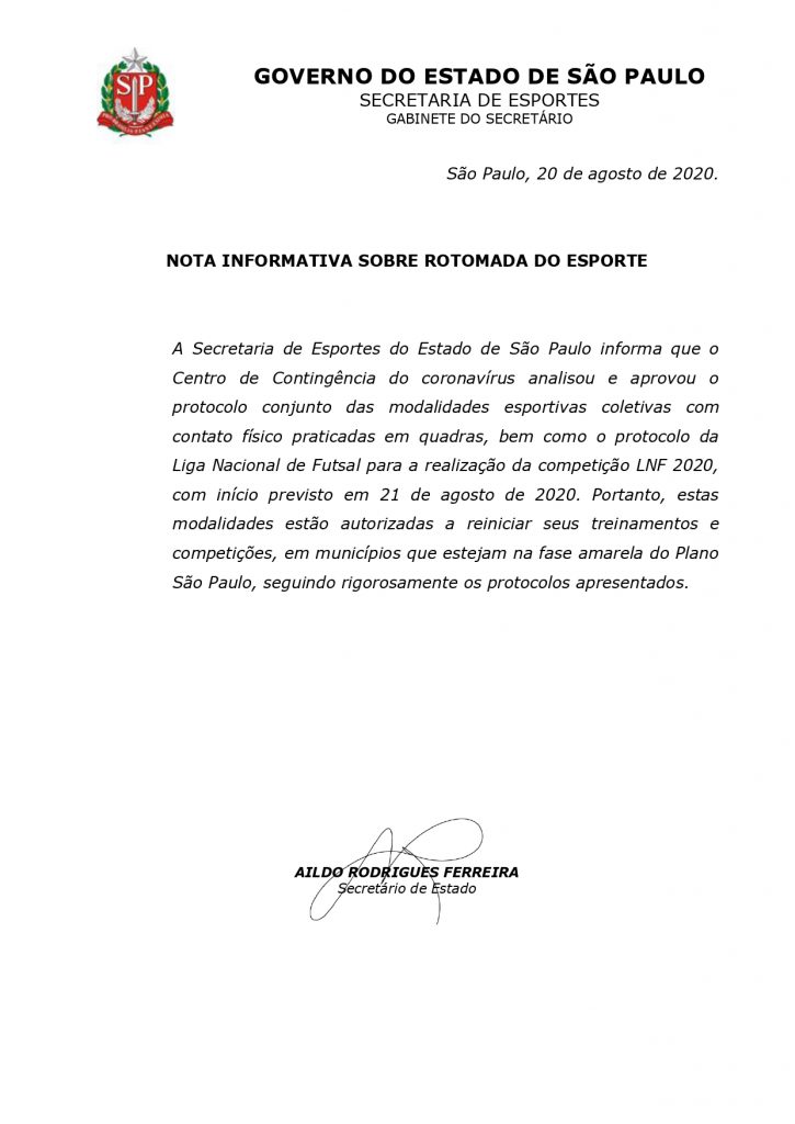A Secretaria de Esportes do Estado de São Paulo informa que o Centro de Contingência ao Covid-19, analisou e aprovou o protocolo conjunto das modalidades esportivas coletivas de contato físico praticadas em quadras e também o protocolo da Liga Nacional de Futsal para a realização da competição LNF 2020 com início previsto em 21 de agosto de 2020. Portanto, estas modalidades estão autorizadas a reiniciar seus treinamentos e competições, em municípios que estejam na fase amarela do Plano São Paulo, seguindo rigorosamente os protocolos apresentados.