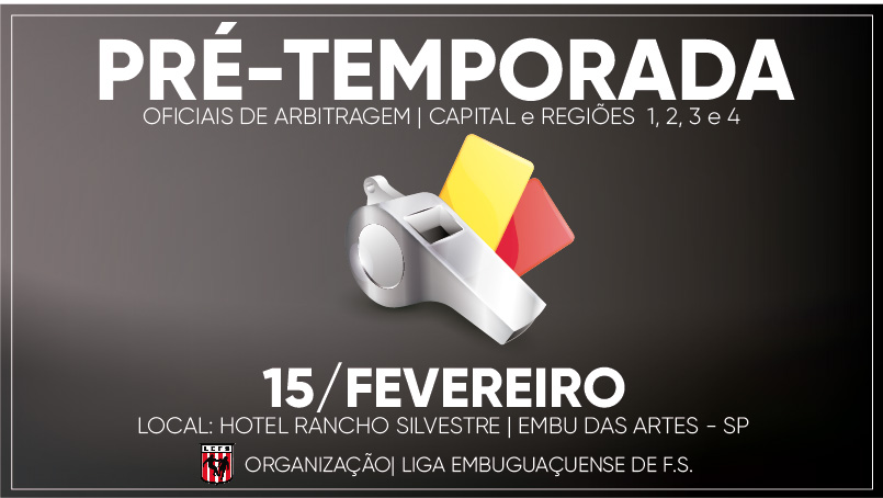 As ligas filiadas, juntamente com a FPFS e oficiais de arbitragem, buscando a necessidade de aprimoramento, unificação, padronização, capacitação, atualização e aplicação de avaliação teórica, realizará neste sábado a pré- temporada dos oficiais de arbitragem, sediada pela Liga Embuguaçuense de Futebol de Salão.