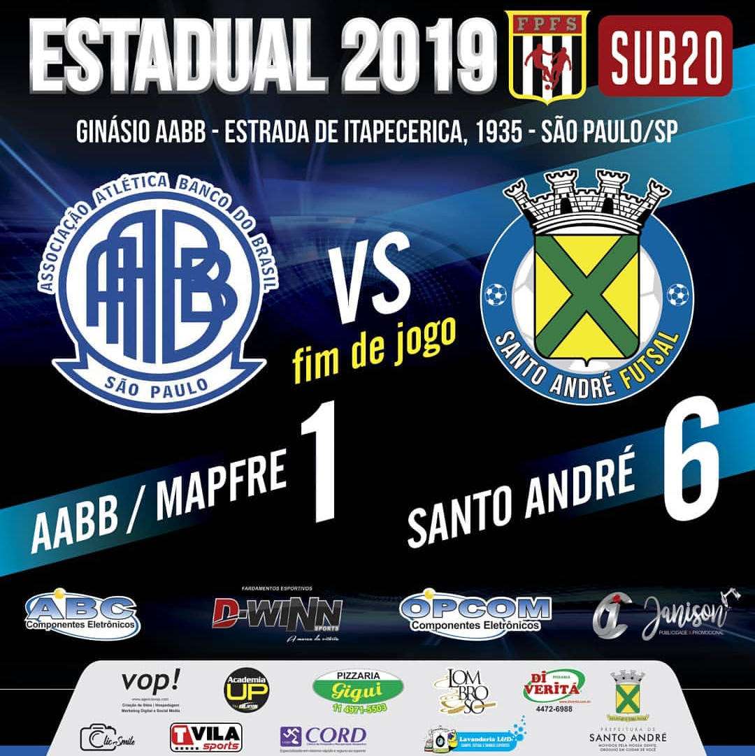 Ontem, 20/09, ocorreu a última partida da semana do Campeonato Estadual Sub-20, no Ginásio AABB, entre A.A Banco do Brasil e Santo André Futsal, a equipe visitante venceu por 6 a 1 e garantiu os três pontos na classificação.